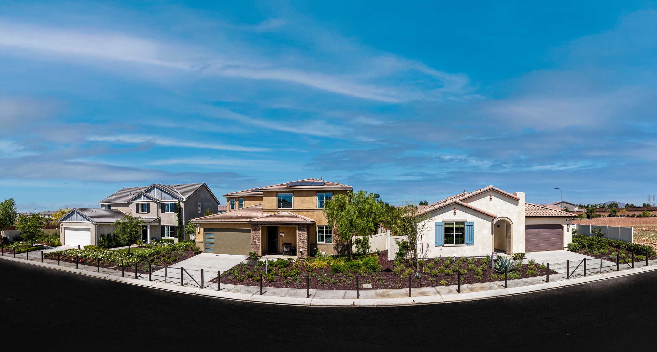 Southwest Prairie style blends stucco and brick with broad hip roofs, wide fronts, and refined window placement for a clean, modern feel.